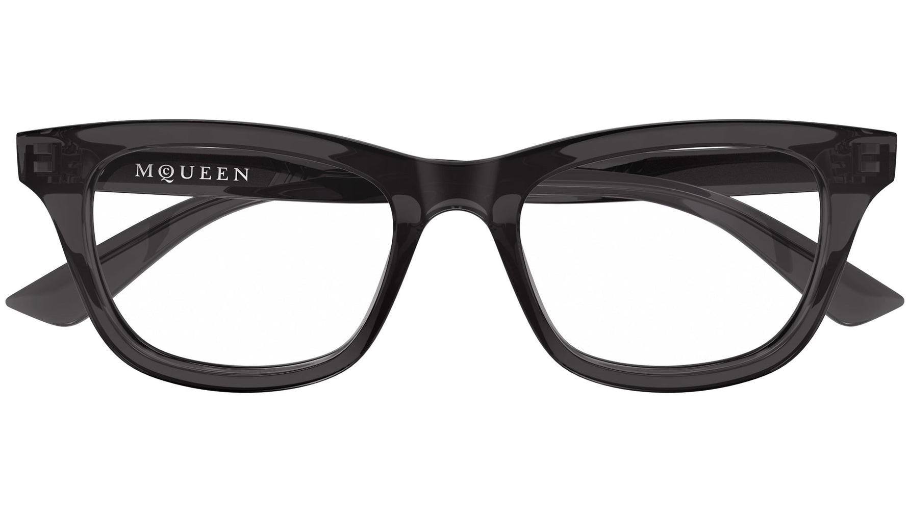 Occhiali da vista Alexander McQueen Logo modello AM0515O in acetato riciclato cat eye codice colore 009 grigio scuro trasparente lucido con aste grigio e lenti demo. Rivenditore autorizzato Alexander McQueen online. Gli occhiali vengono consegnati con custodia e accessori originali e sono coperti dalla garanzia ufficiale di 12 mesi del produttore.