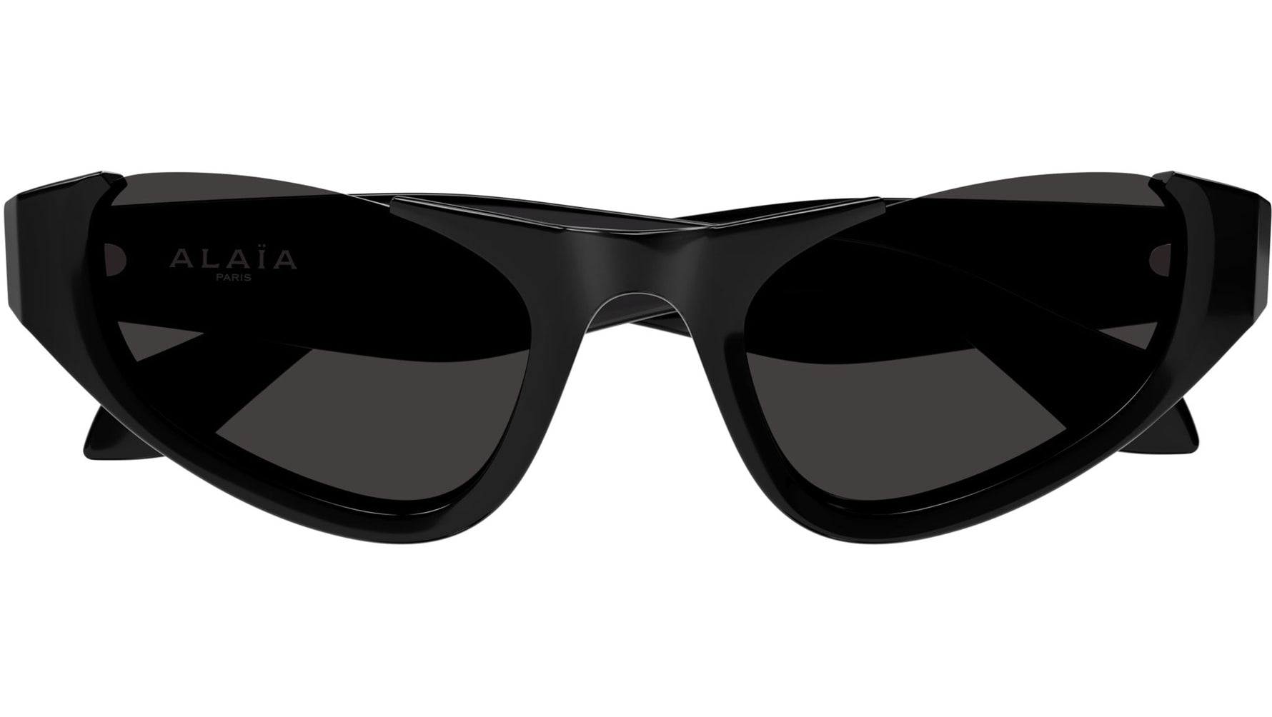 Occhiali da sole Azzedine Alaïa modello AA0076S linea Lettering Logo forma cat eye in acetato riciclato, codice colore 001 nero lucido tinta unita con aste color nero e lenti color grigio tinta unita.