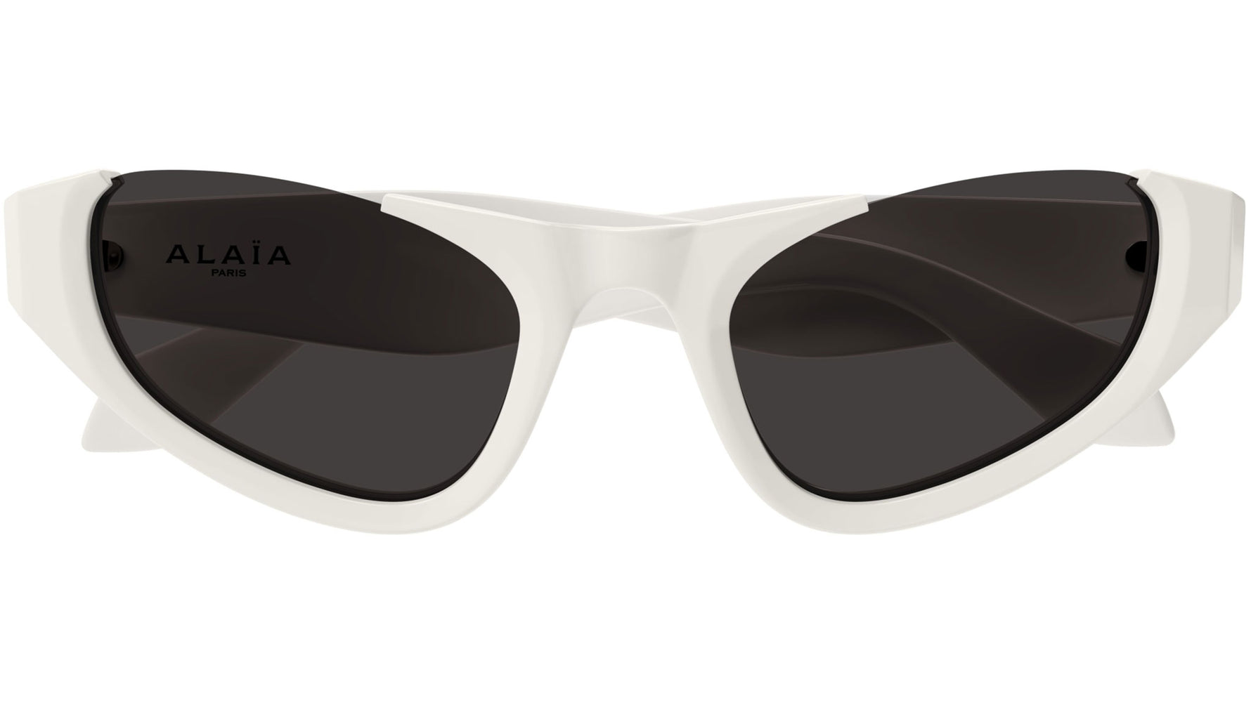 Occhiali da sole Azzedine Alaïa modello AA0076S linea Lettering Logo forma cat eye in acetato riciclato, codice colore 002 avorio tinta unita lucido con aste color bianco e lenti color grigio tinta unita.