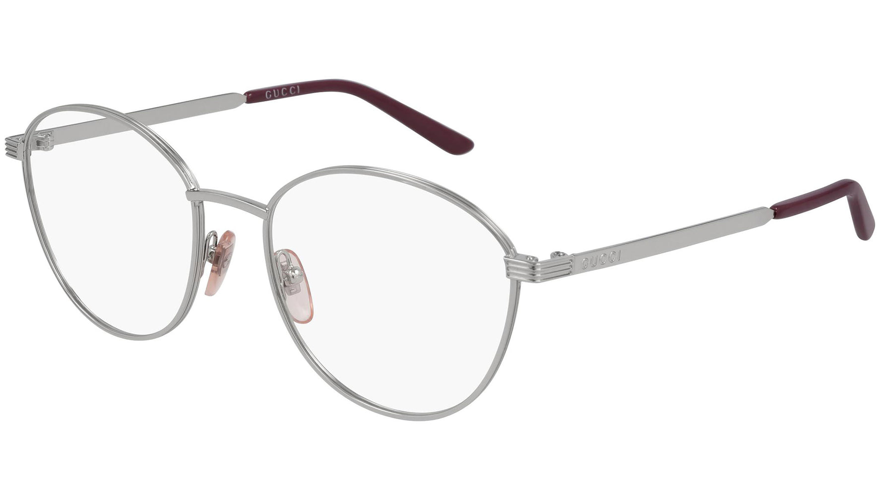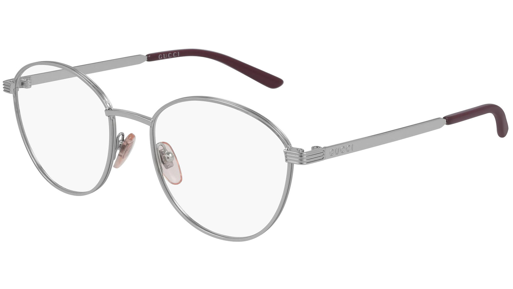 Occhiali da vista Gucci Logo modello GG0806O 002, variante colore argento lucido con astine color borgogna e argento. Gucci Eyewear è sinonimo di eleganza e raffinatezza. Le creazioni eclettiche e contemporanee della Maison, insuperabili in termini di qualità, attenzione ai dettagli e design innovativo, esprimono l'apice dell'artigianato italiano.