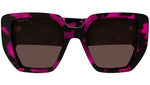 Occhiali da sole Gucci linea Lettering modello GG0956S 008 in acetato nero lucido maculato avana fuchsia con aste color tartaruga e lenti viola marrone tinta unita.