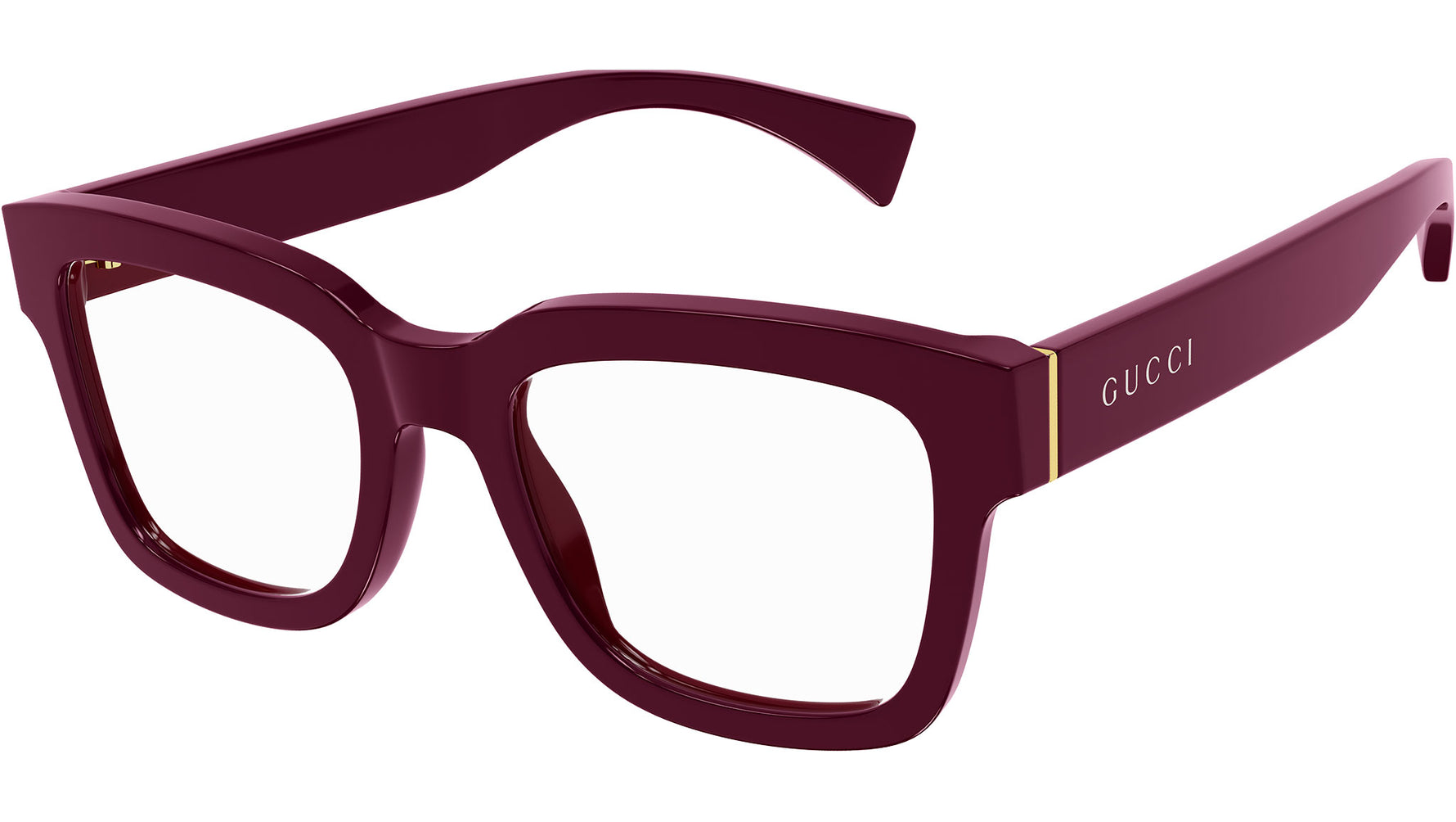 Occhiali da vista Gucci linea Gucci Logo modello GG1138O variante colore 003 bordeaux tinta unita lucido con astine color rosso borgogna.