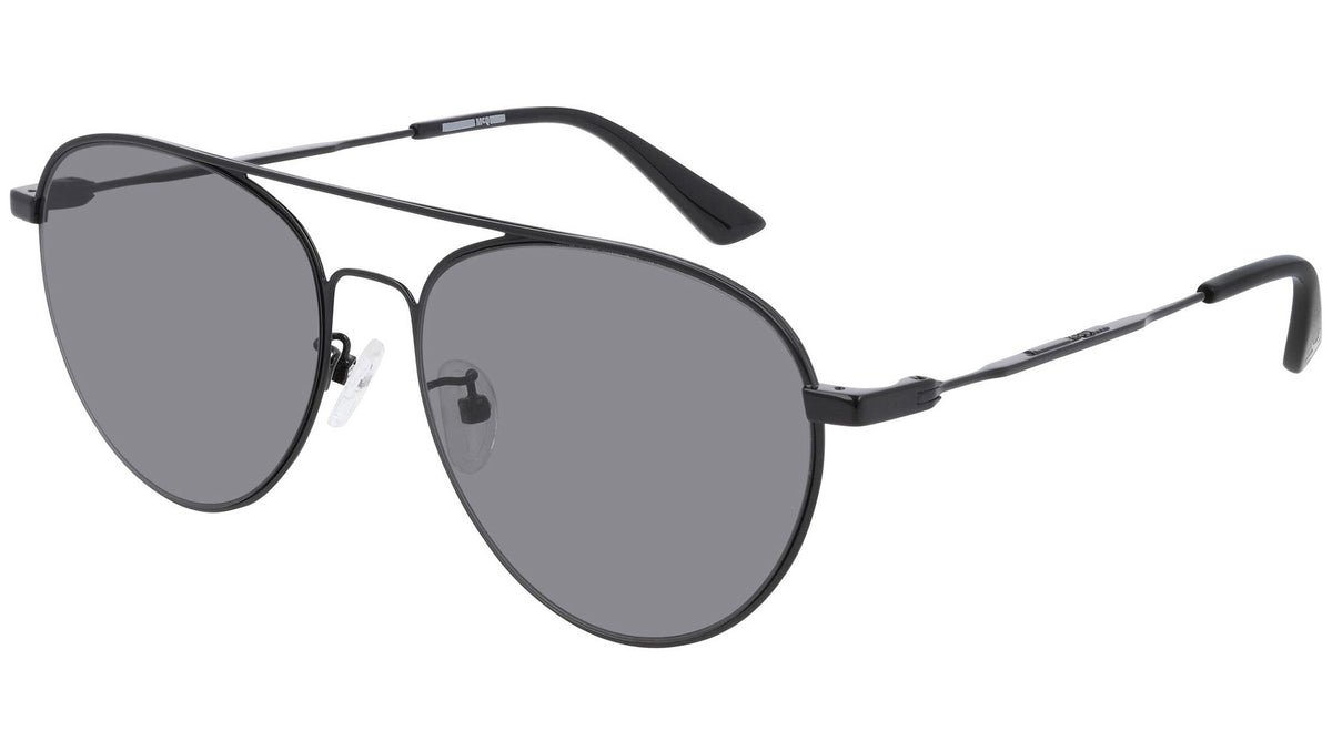 McQ sunglasses collection model MQ0246SA 001 featuring shiny black frame and solid smoke lens. Provocative and irreverent, the McQ eyewear collections draw inspiration from urban streetwear and youth subcultures.