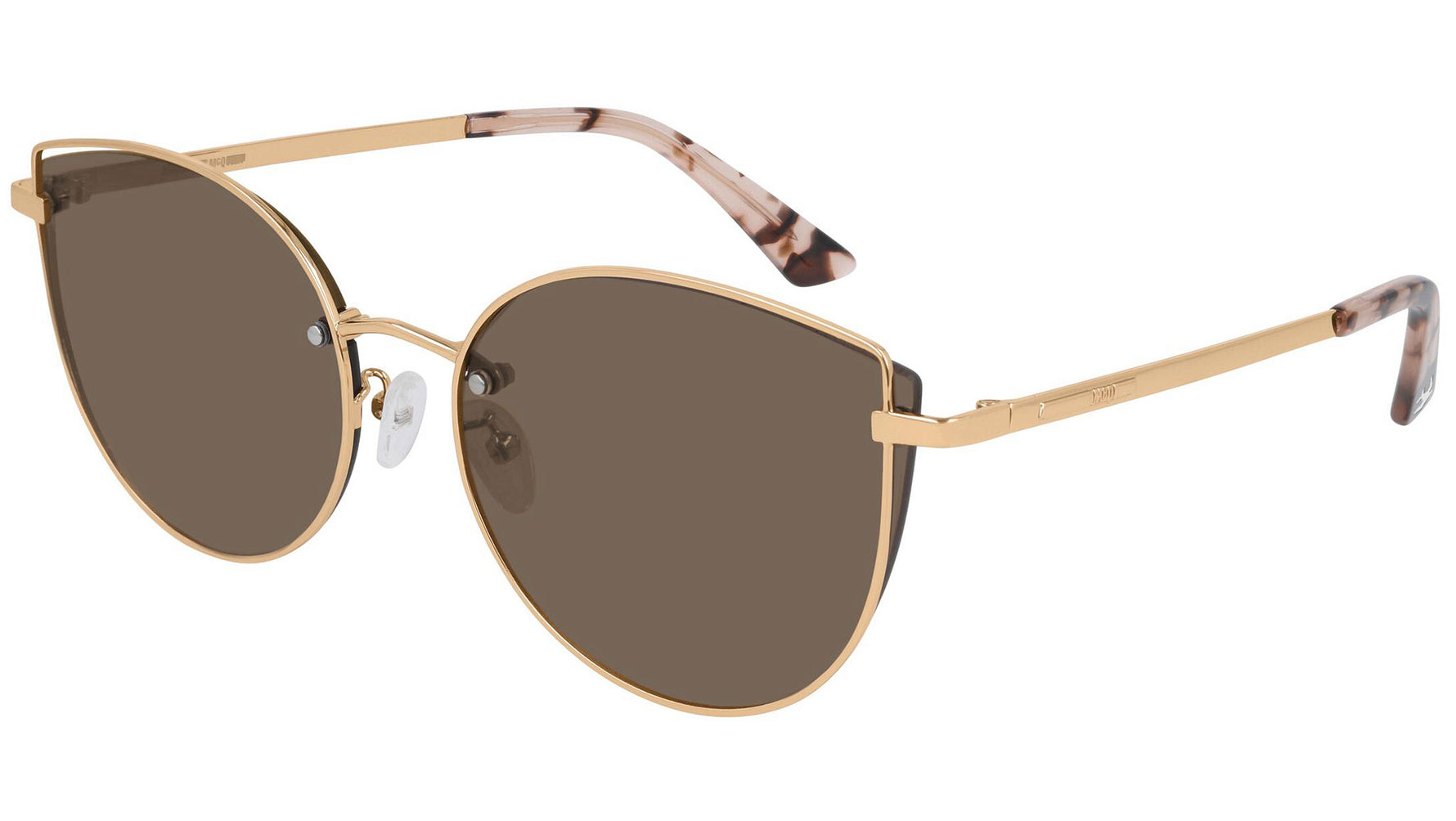 McQ sunglasses collection model MQ0248SK 002 featuring shiny rose gold frame and solid brown lens. Provocative and irreverent, the McQ eyewear collections draw inspiration from urban streetwear and youth subcultures.