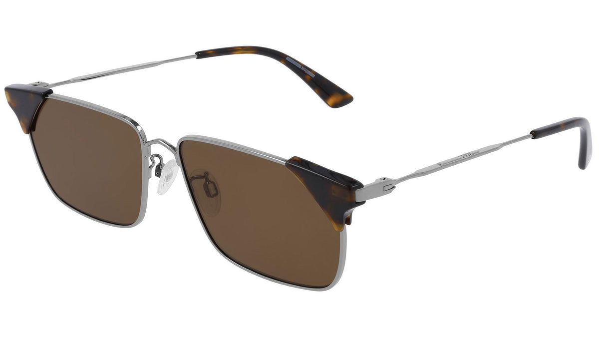 McQ sunglasses collection model MQ0265S 002 featuring shiny light ruthenium frame and solid brown lens. Provocative and irreverent, the McQ eyewear collections draw inspiration from urban streetwear and youth subcultures.