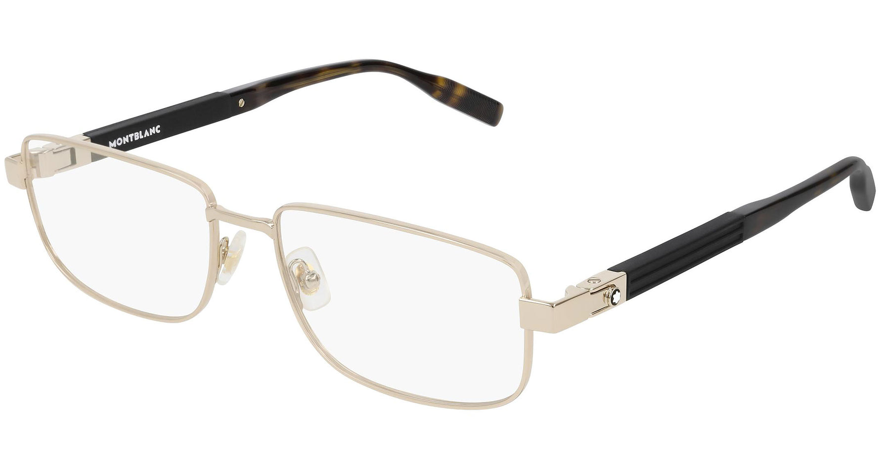 Montblanc Eyewear model MB0034O 006 featuring shiny light gold frame and black temple. Montblanc revolutionized the culture of writing with breakthrough innovations. Today, the Maison continues to push boundaries and evolve the expression of fine craftsmanship across each of its product categories: the pinnacle of luxury writing instruments, timepieces, leather goods, accessories, fragrances and eyewear.