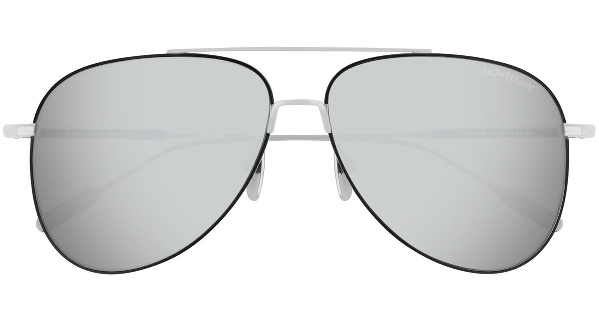 Montblanc sunglasses collection model MB0078S 002 featuring silver shiny frame and silver lens. Montblanc revolutionized the culture of writing with breakthrough innovations. Today, the Maison continues to push boundaries and evolve the expression of fine craftsmanship across each of its product categories: the pinnacle of luxury writing instruments, timepieces, leather goods, accessories, fragrances and eyewear.