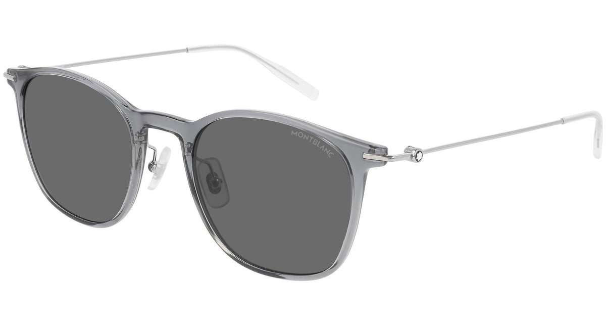Montblanc sunglasses collection model MB0098S 005 featuring shiny transparent grey copy of ab2884 mazzucchelli frame and grey lens. Montblanc revolutionized the culture of writing with breakthrough innovations. Today, the Maison continues to push boundaries and evolve the expression of fine craftsmanship across each of its product categories: the pinnacle of luxury writing instruments, timepieces, leather goods, accessories, fragrances and eyewear.