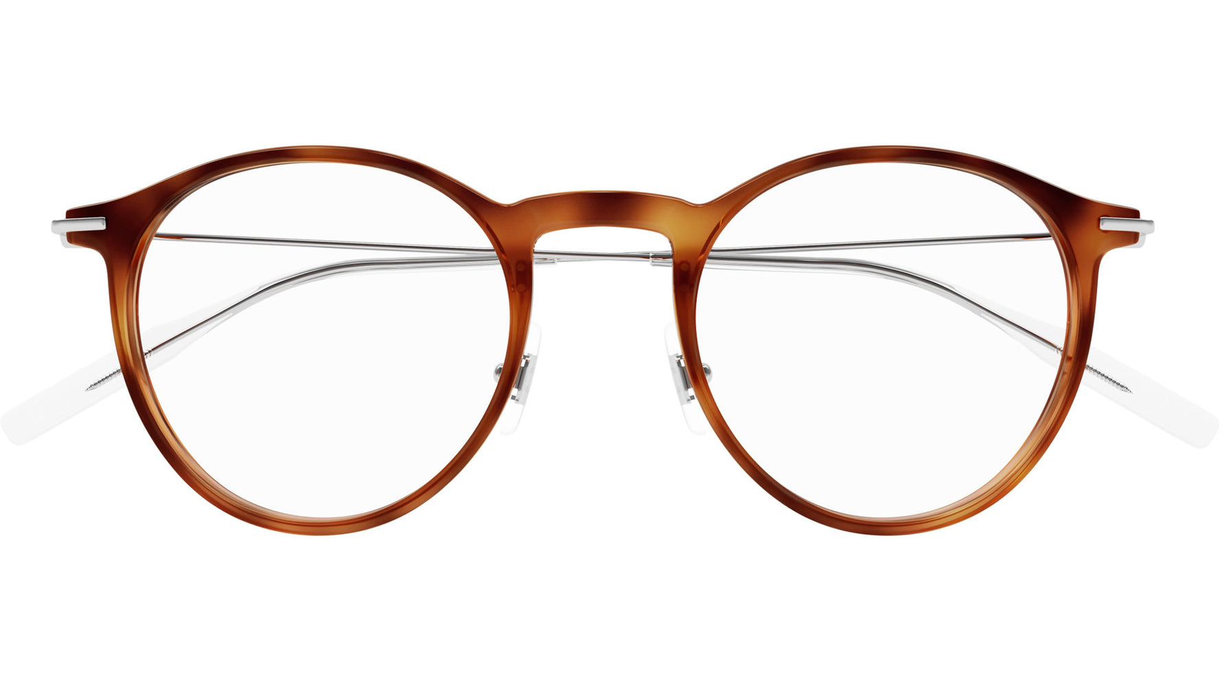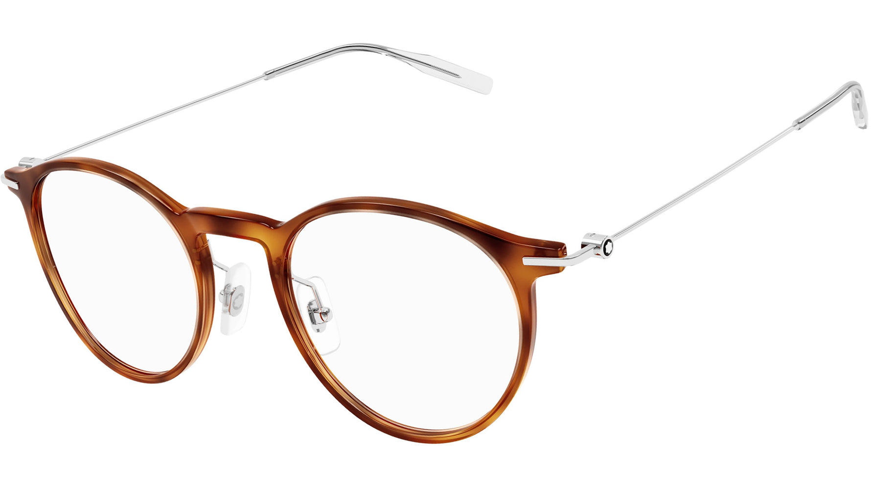 Occhiali da vista Monblanc linea Established modello MB0099O variante colore 008 avana biondo lucido con astine color lenti demo.