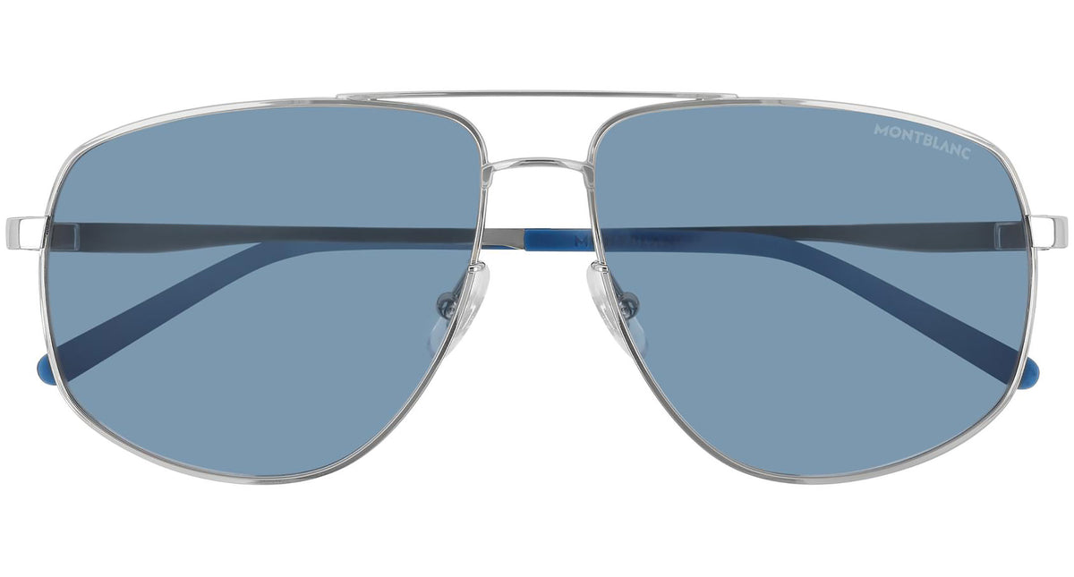 Montblanc sunglasses collection model MB0102S 003 featuring shiny silver frame and blue lens. Montblanc revolutionized the culture of writing with breakthrough innovations. Today, the Maison continues to push boundaries and evolve the expression of fine craftsmanship across each of its product categories: the pinnacle of luxury writing instruments, timepieces, leather goods, accessories, fragrances and eyewear.