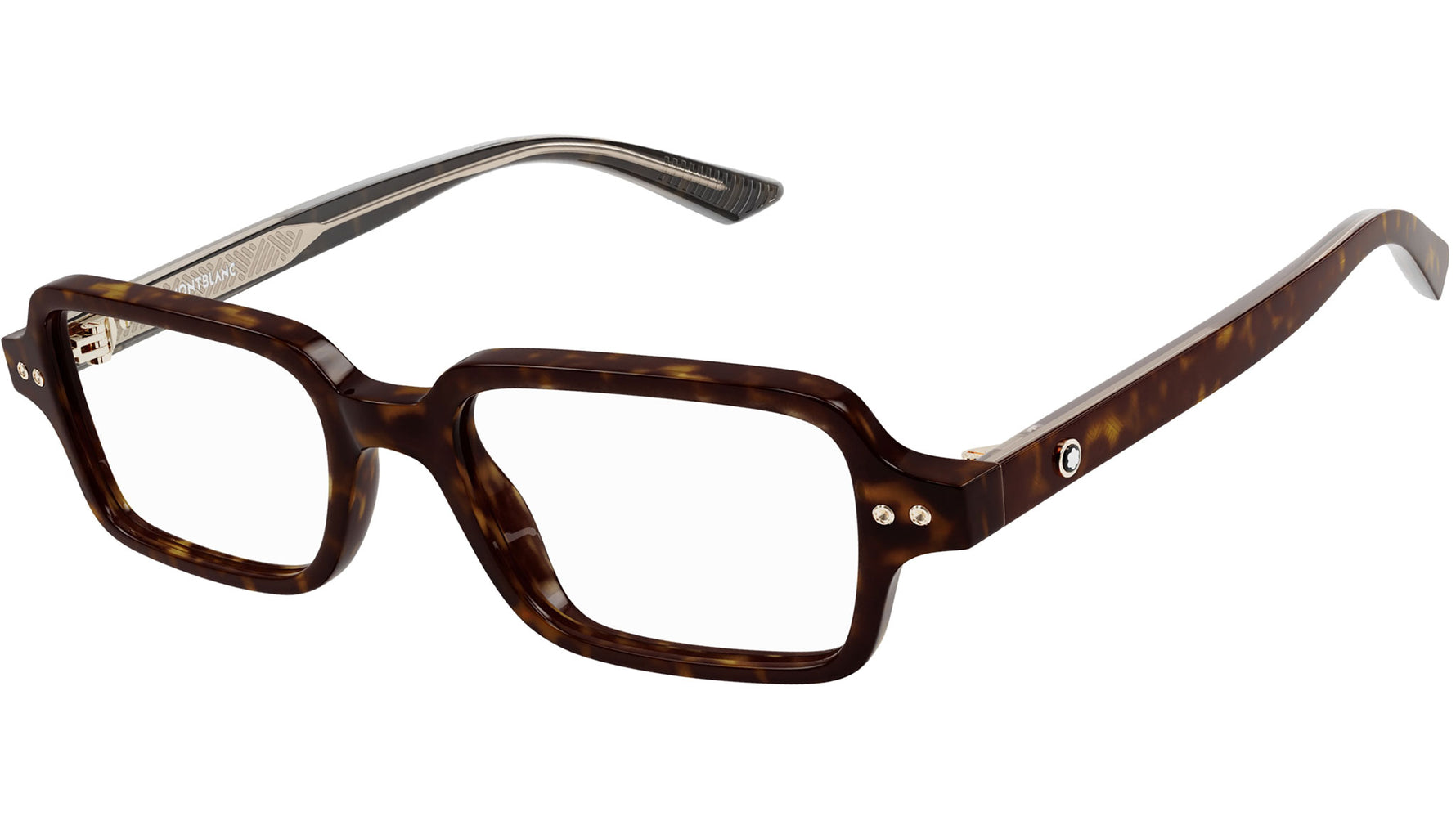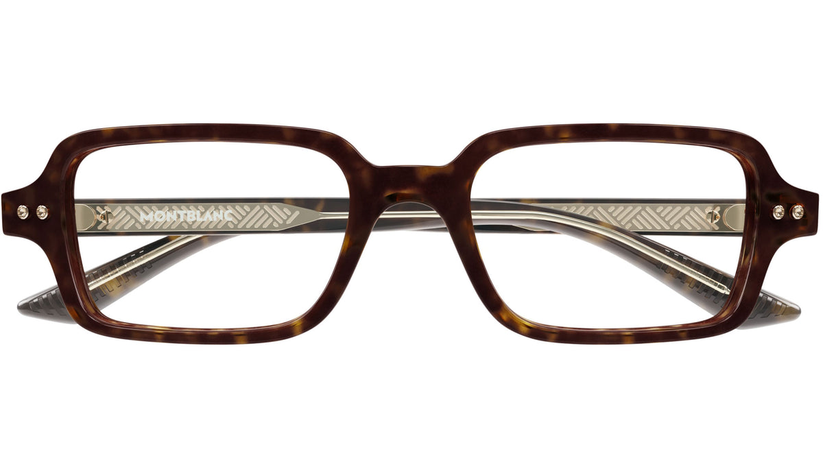 Occhiali da vista Monblanc linea Millennials modello MB0257O variante colore 002 tartaruga scuro lucido con astine color lenti demo.