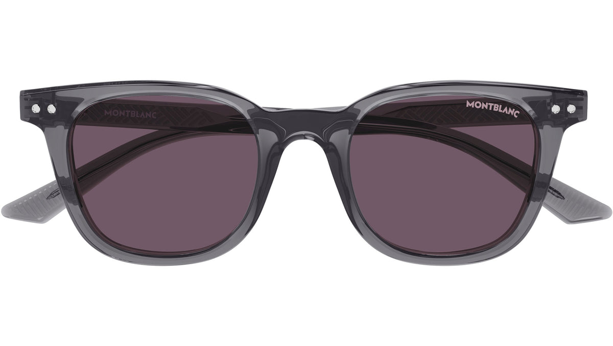 Occhiali da sole Montblanc modello MB0320S linea Snowcap forma panto in acetato riciclato, codice colore 004 grigio scuro trasparente lucido con aste color grigio e lenti color viola scuro solido.