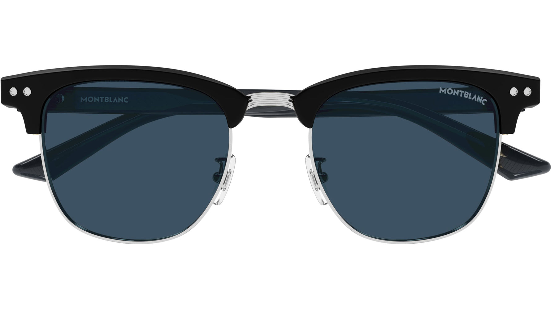 Occhiali da sole Montblanc MB0382S 002 uomo con montatura rettangolare in acetato riciclato nero opaco / frontale in metallo rutenio chiaro lucido e lenti blu tinta unita. Linea: Snowcap. Codice modello: MB0382S. Codice colore: 002. Made in Italy. Rivenditore autorizzato Montblanc online. Gli occhiali vengono consegnati con custodia e accessori originali e sono coperti dalla garanzia ufficiale di 12 mesi del produttore.