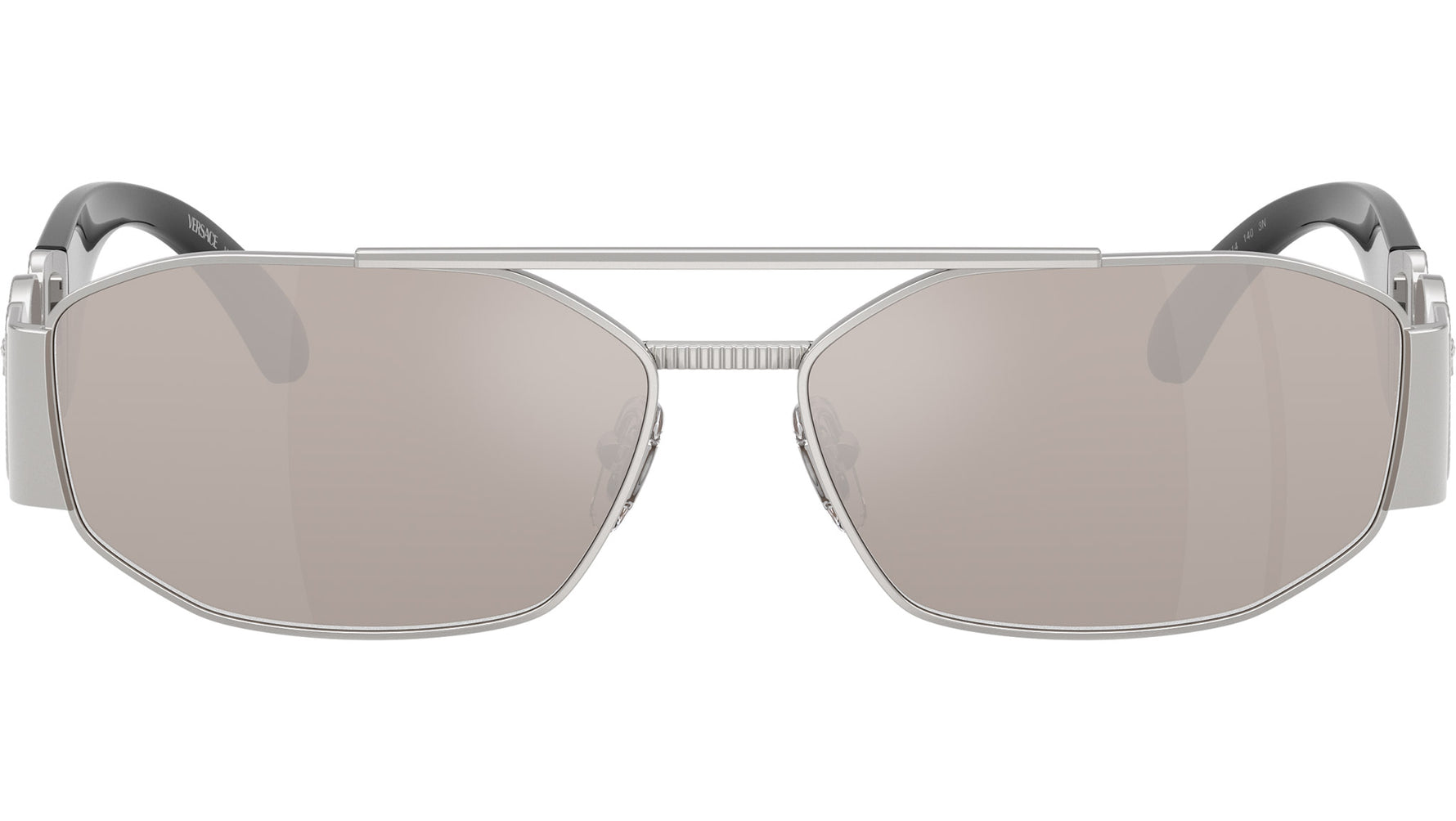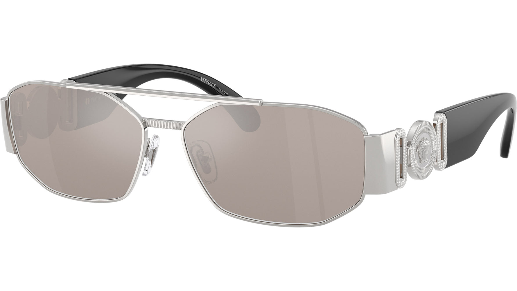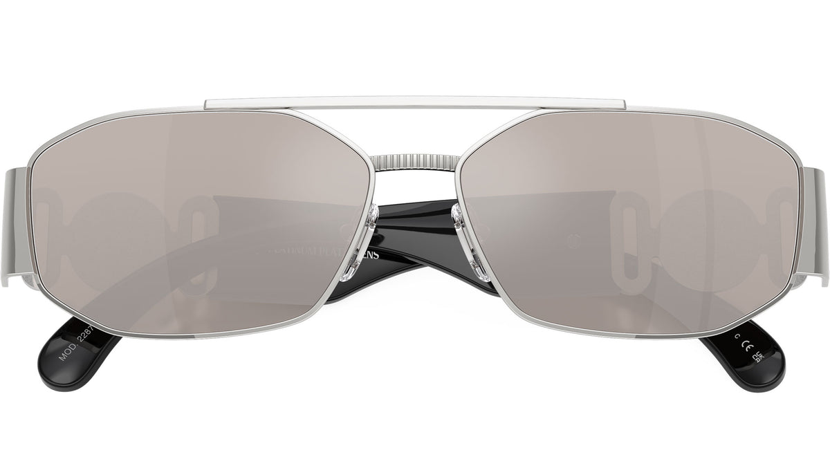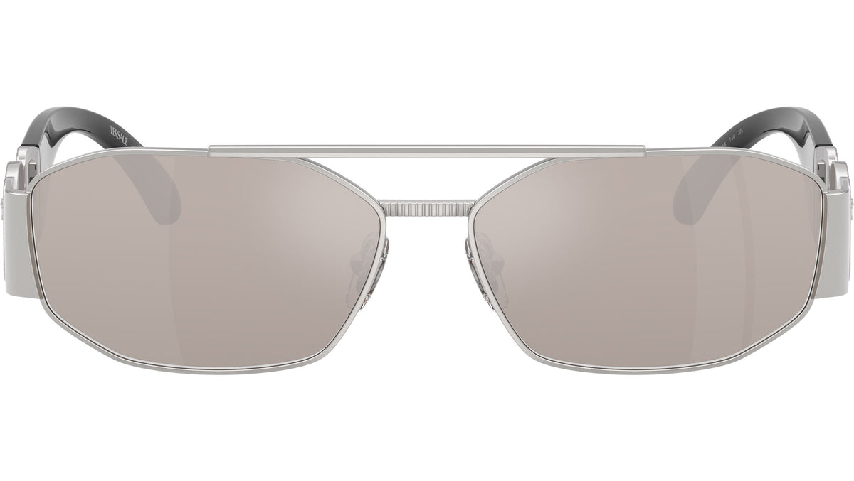 Occhiali da sole Versace uomo modello VE2287 1000AP con montatura geometrica in metallo argento e lenti base 4 in policarbonato trasparente a specchio platino reale. Naselli regolabili. Linea: Iconic. Codice Brand: 0VE2287. Codice colore: 1000AP. Rivenditore autorizzato online Versace Eyewear. Ogni prodotto Versace viene consegnato con astuccio originale e accessori ed è coperto da garanzia del produttore di 12 mesi.