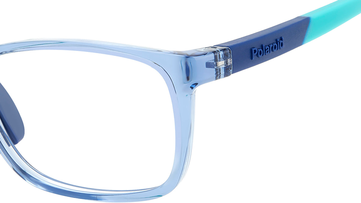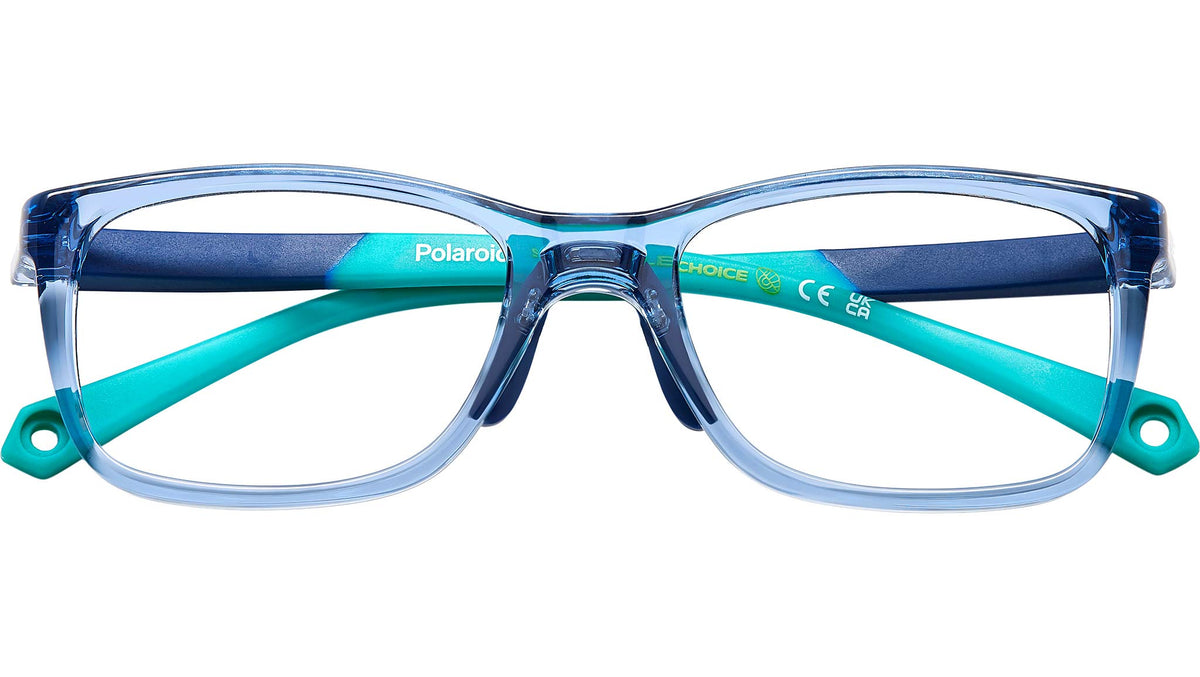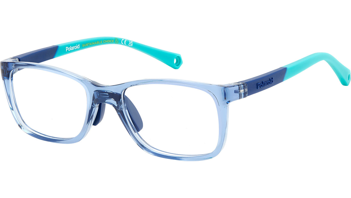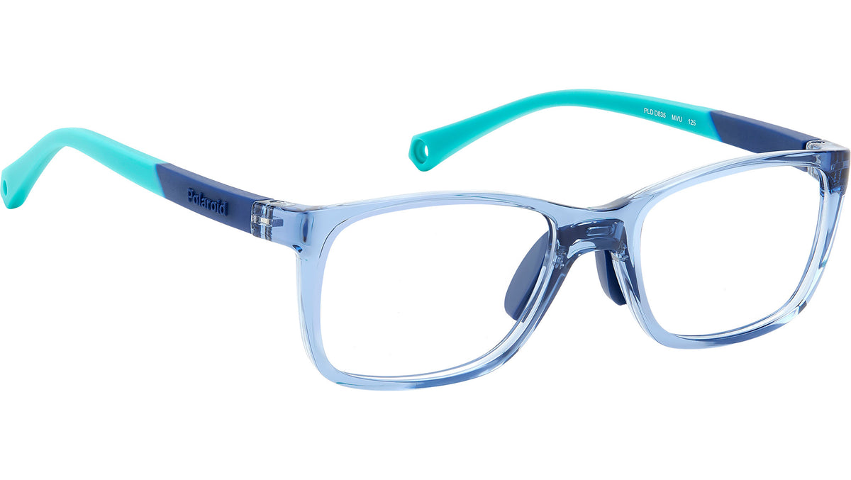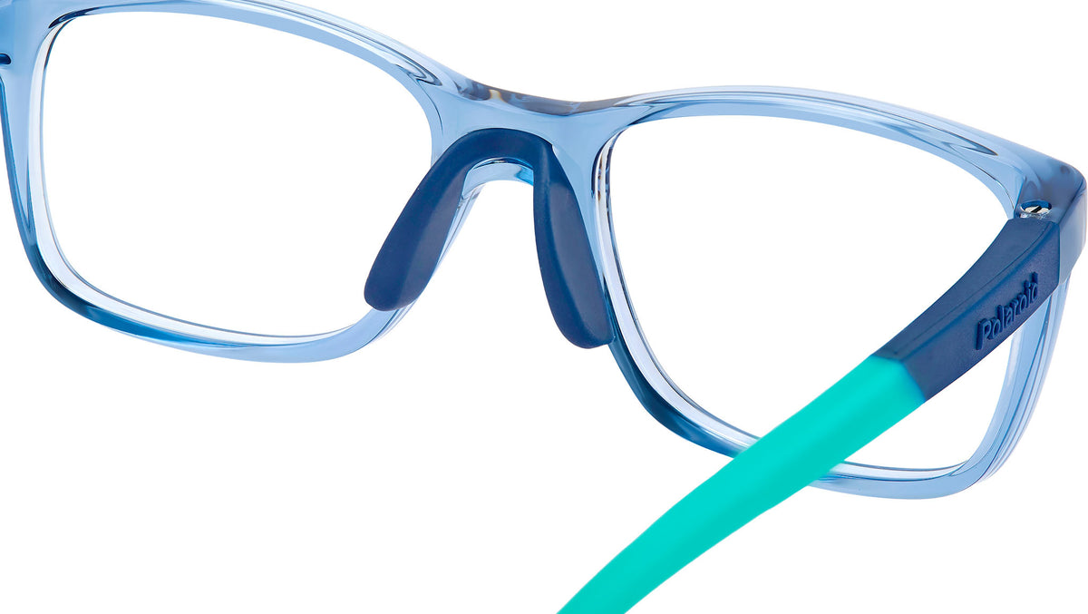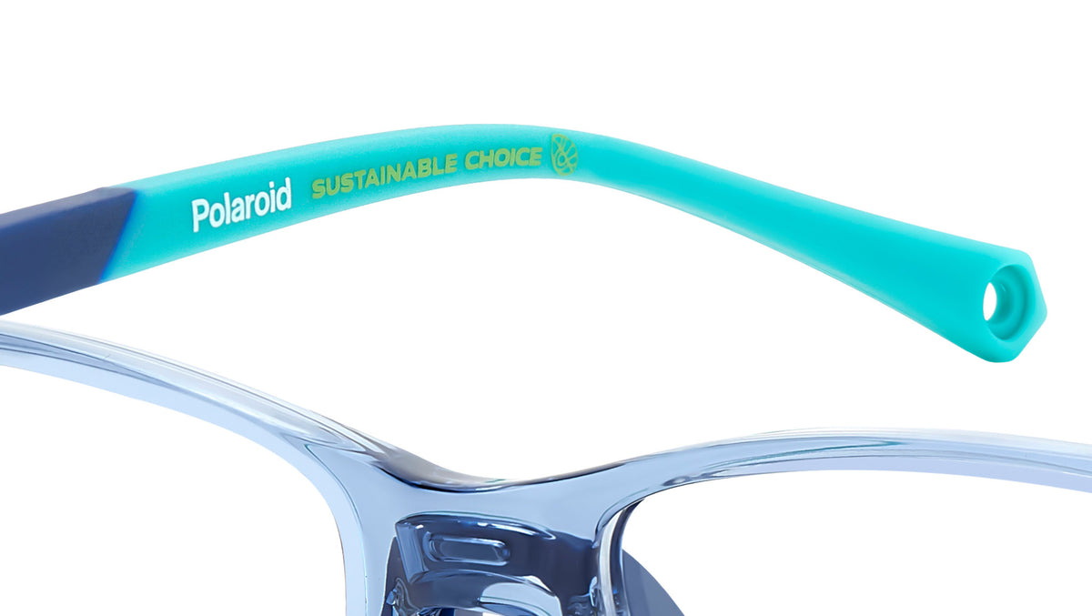 Occhiali da vista Polaroid Kids PLD D835 MVU junior con montatura in azzurro e lenti demo. Occhiali da vista Polaroid per bambini tra i 4 e i 6 anni. Il frontale rettangolare in eco-poliammide presenta naselli in gomma regolabili, per una vestibilità più aderente. Le aste gommate sono soft e nascondono l’anima in Memory Metal, materiale capace di recuperare sempre la sua forma, anche quando piegato. Il modello può essere completato dal cordino elastico acquistabile separatamente. La dicitura “Sustainable Choice” attesta l’impegno green di Polaroid. Linea: Kids. Codice modello: 108244. Codice colore: MVU. Rivenditore autorizzato Polaroid Kids online. Gli occhiali vengono consegnati con custodia e accessori originali e sono coperti dalla garanzia ufficiale di 12 mesi del produttore.