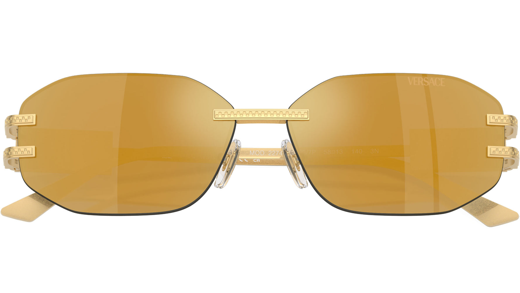Occhiali da sole Versace donna modello 2274 rimless in metallo color oro con lenti marrone oro a specchio base 2. Naselli regolabili. Linea: Fashion Id. Codice brand: 0VE2274. Codice colore: 10027P. Rivenditore autorizzato online Versace Eyewear. Ogni prodotto Versace viene consegnato con astuccio originale e accessori ed è coperto da garanzia del produttore di 12 mesi.