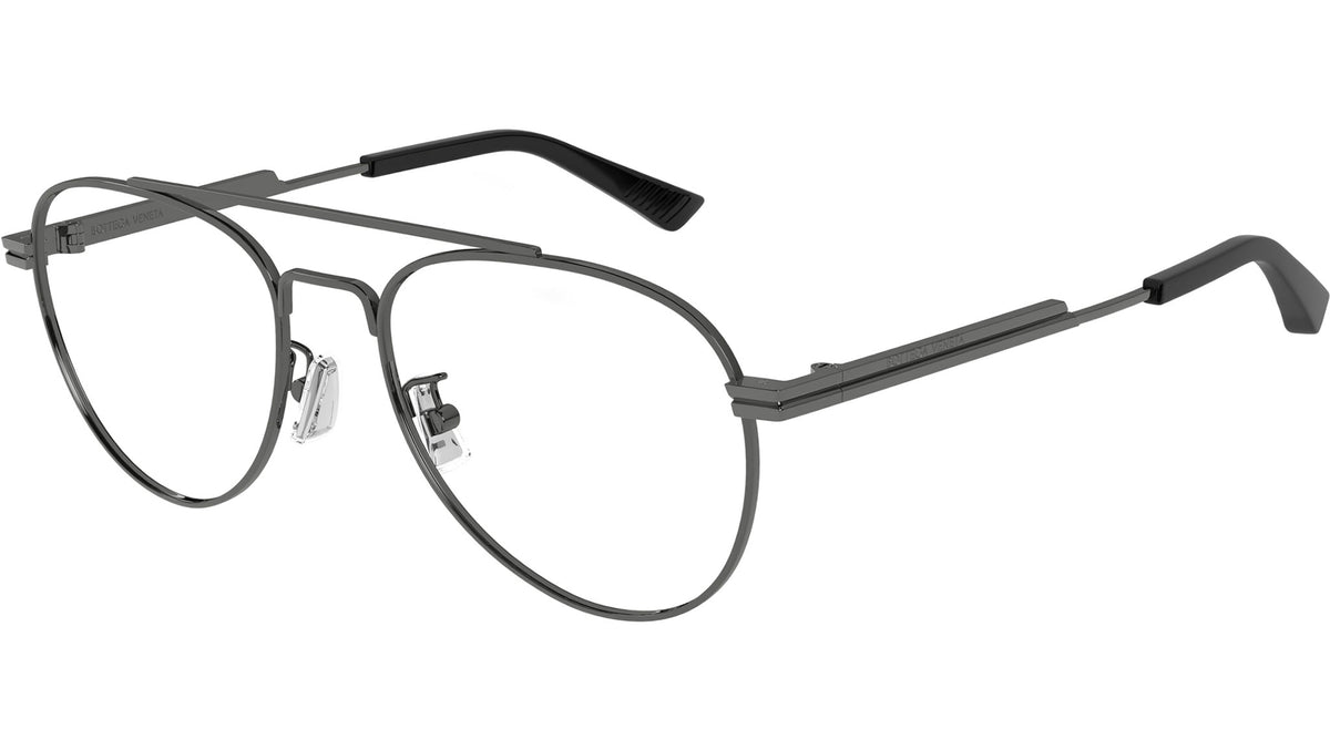 Occhiali da vista Bottega Veneta modello BV1340OK in metallo forma aviatore codice colore 004 rutenio scuro lucido con lenti demo. Rivenditore autorizzato Bottega Veneta online. Gli occhiali vengono consegnati con custodia e accessori originali e sono coperti dalla garanzia ufficiale di 12 mesi del produttore.