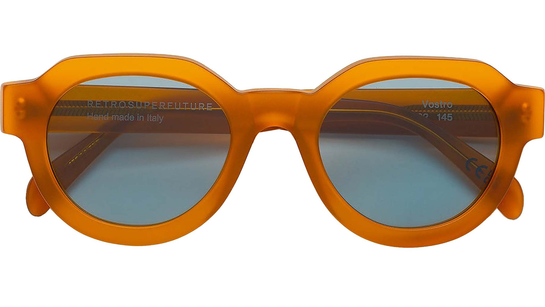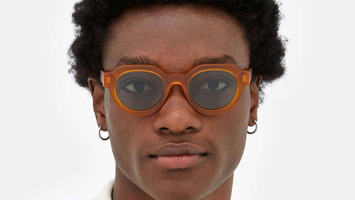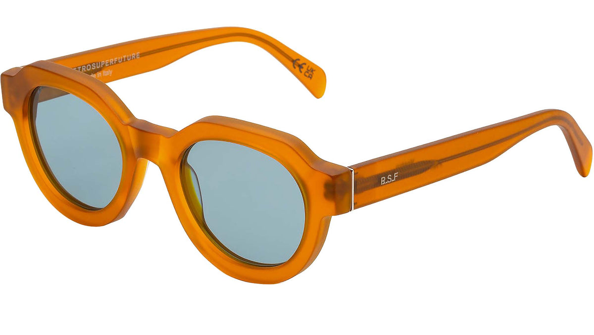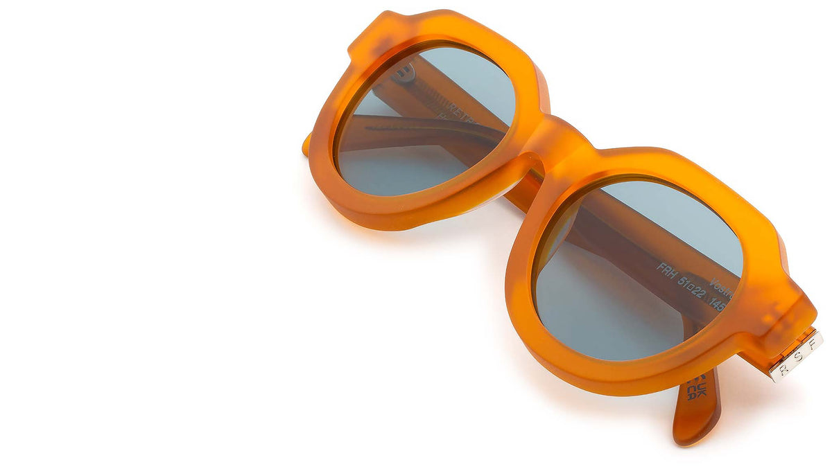 Vostro is a sleek rounded shape that captures the essence of timeless style, updating it with a contemporary design twist. Sharp, geometric rims are matched with soft oval lenses as an elevated version of classic rounded sunglasses. The model’s design is characterised by pentagonal shaped rims, with sturdy temple tips and a lowered nose-bridge for an essential yet determined, elegant piece. This version of Vostro features a soft clay acetate and turquoise lenses. Sizes: R Lens Width: 51 mm. Frame Front: Frame Side: 145 mm. Product Code Size R: FRH