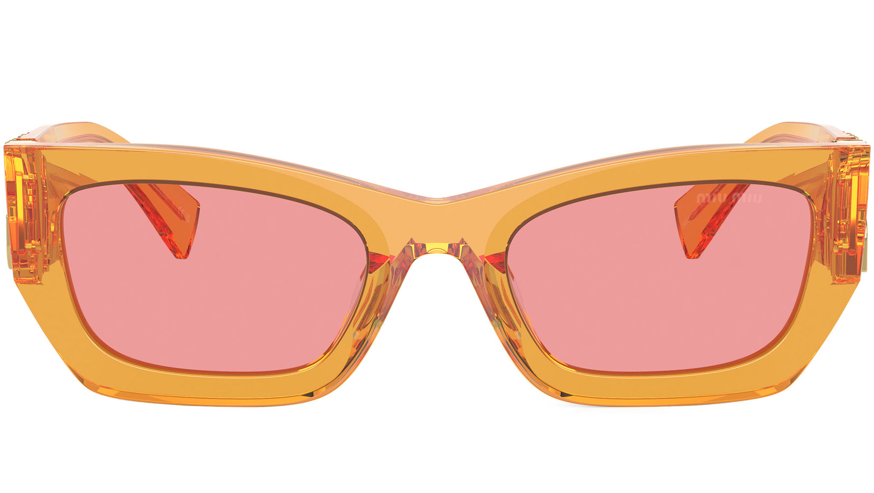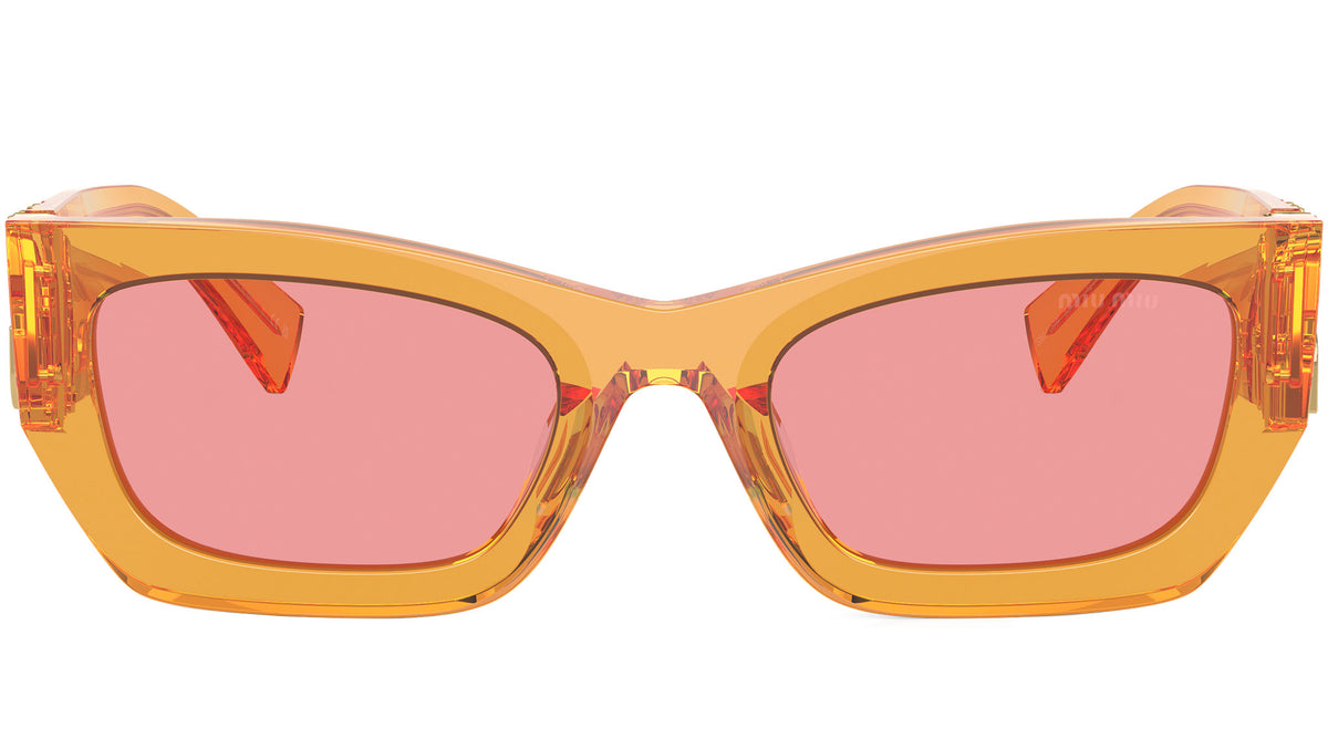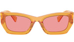 Occhiali da sole Miu Miu modello 09WS codice colore 12T1D0 con montatura in acetato color arancione trasparente e lenti in poliammide color rosa. Miu Miu offre creazioni uniche, in cui la costante ricerca stilistica si combina perfettamente con la maestria artigianale della lavorazione. Le silhouette femminili e sinuose delle montature sono espressione di una ricchezza dei dettagli che rispecchia pienamente i codici stilistici e l’indiscusso talento del brand nell’unire il design non convenzionale ad un romanticismo dai rimandi retrò. - Rivenditore autorizzato Miu Miu online. Il prodotto viene consegnato completo di confezione e accessori originali ed è coperto dalla garanzia globale del produttore di 12 mesi.